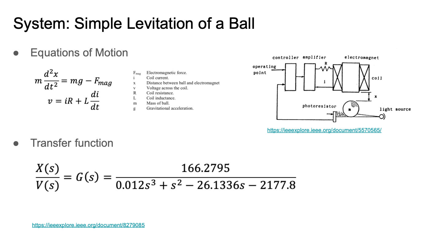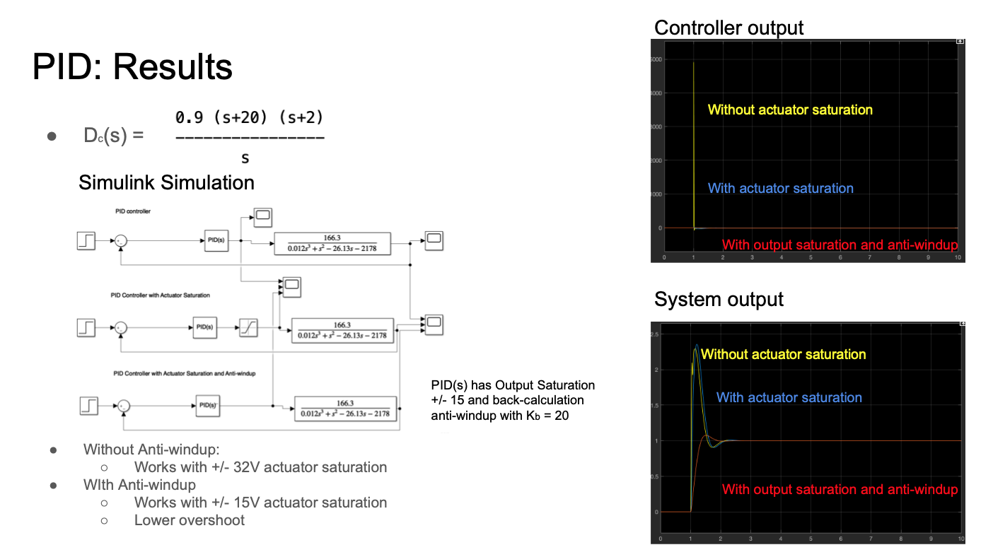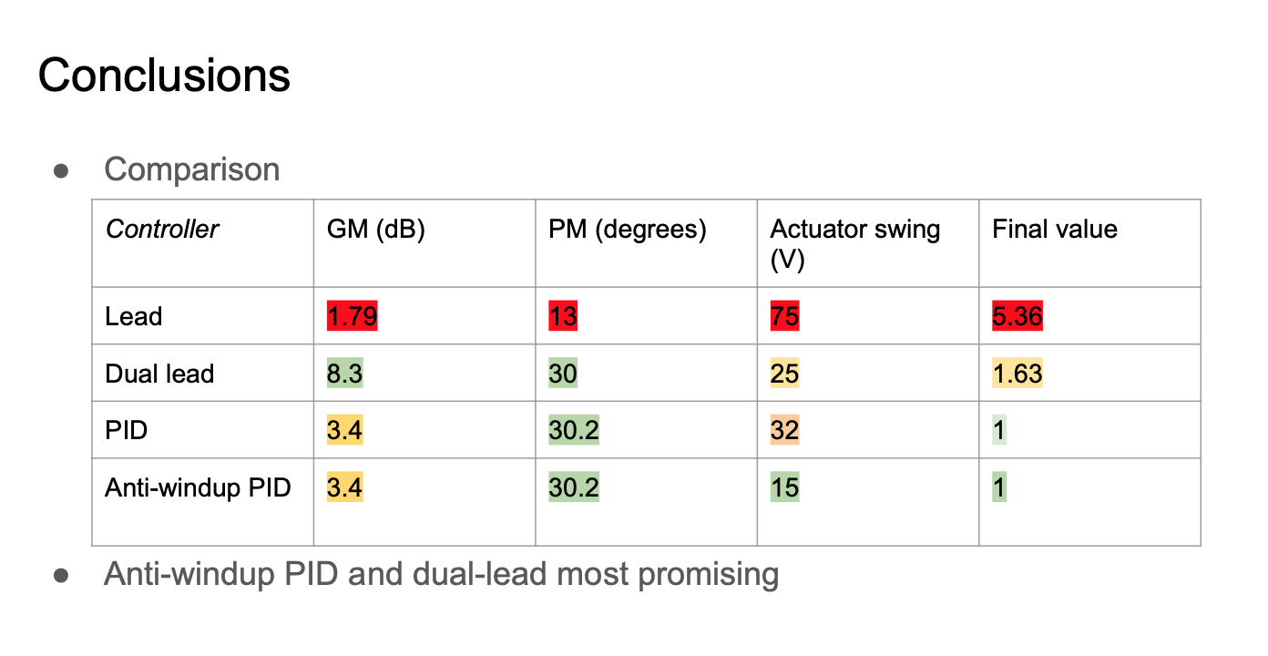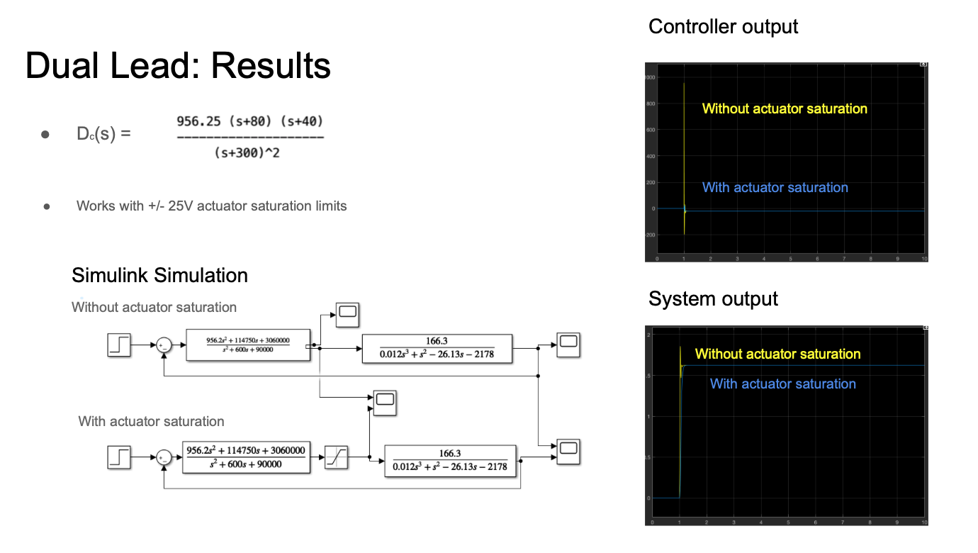 I designed a control system for a magnetic levitation system in Simulink, including a frequency domain compensator (lead) and PID compensator (with anti-windup). I evaluated the pros and cons of each system, and examined analog circuit implementations of the lead compensator control system.
